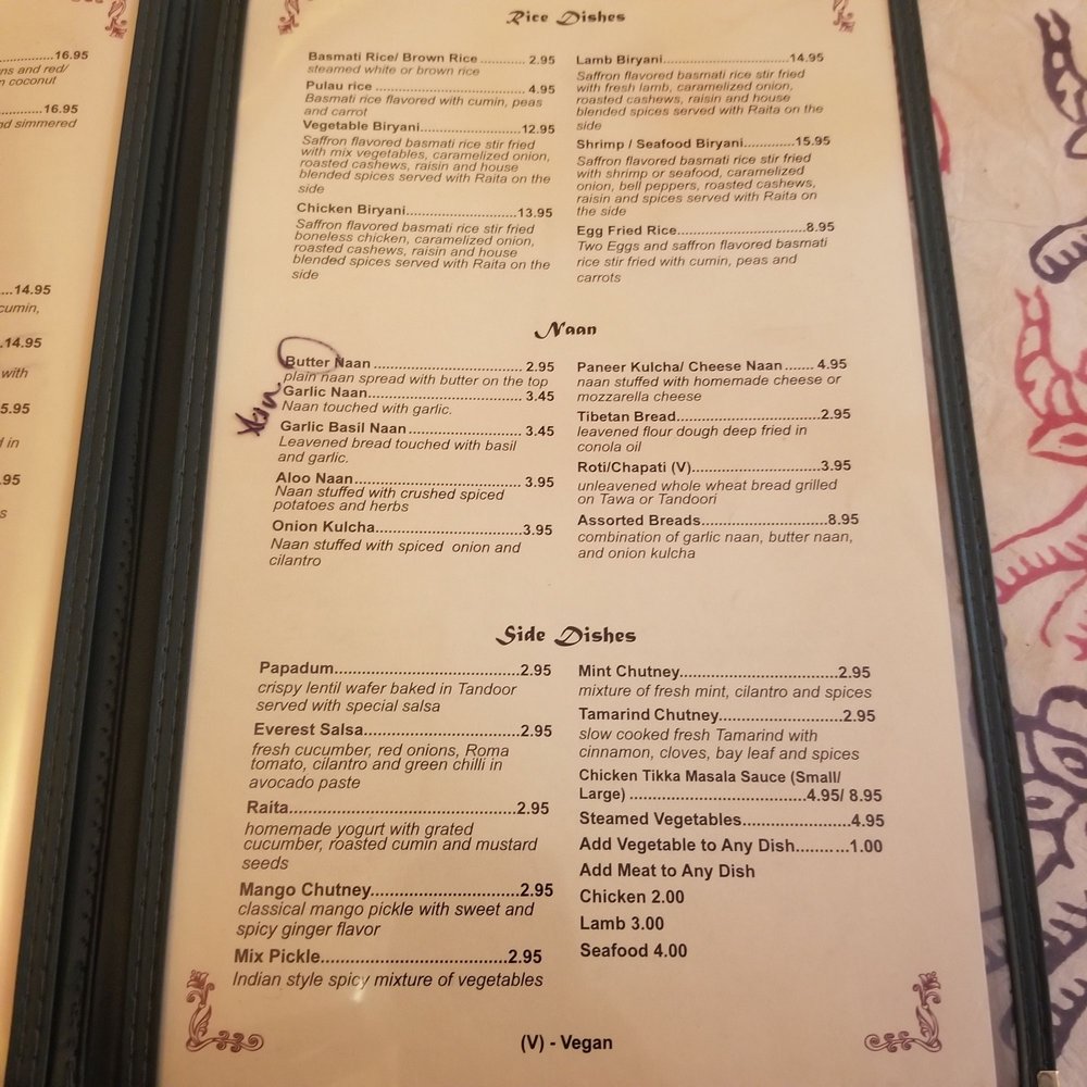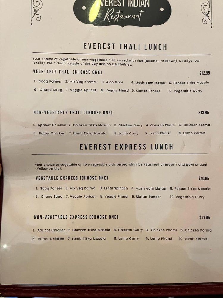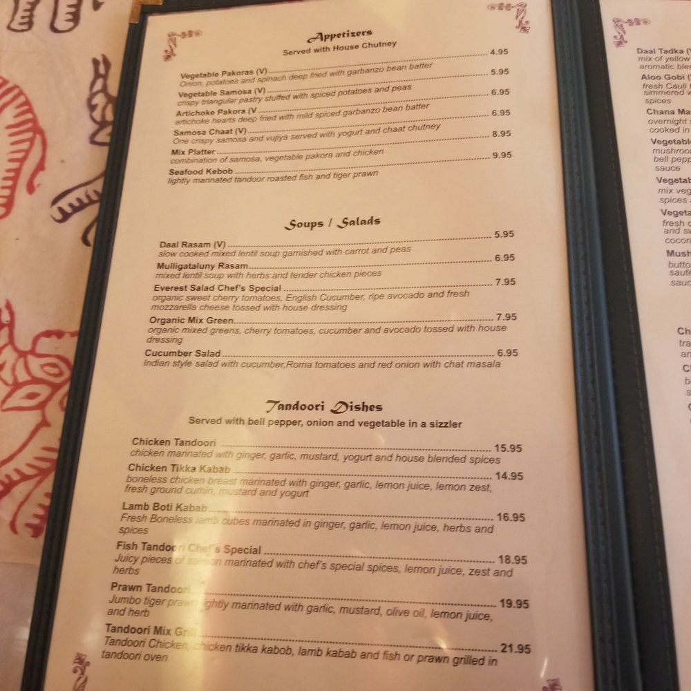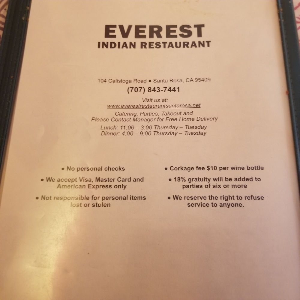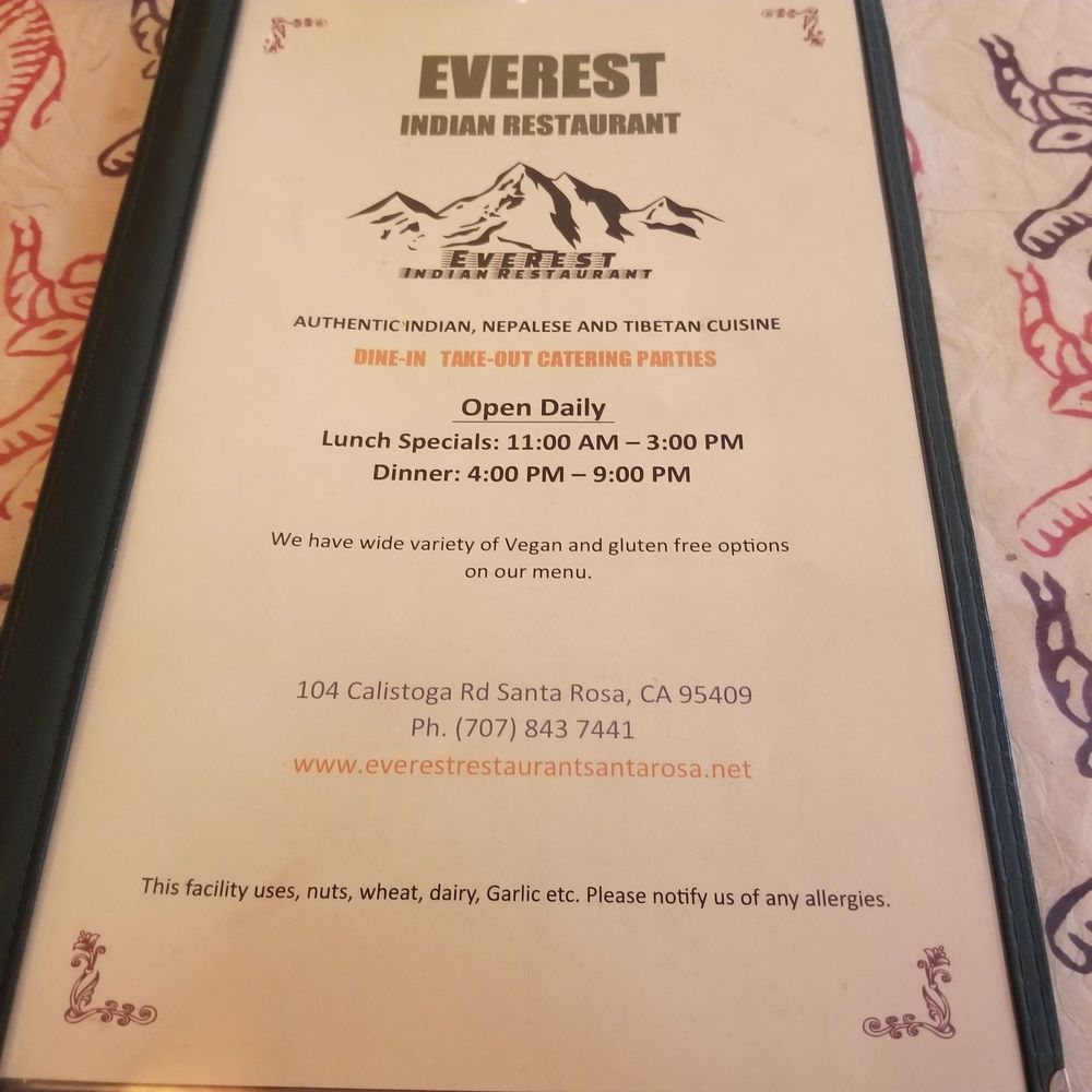 Welcome to Everest Indian Restaurant, a delightful culinary oasis located at 104 Calistoga Rd, Santa Rosa, CA. Specializing in Himalayan and Indian cuisine, Everest offers a vibrant array of seafood and vegetarian options that cater to every palate. The menu features enticing appetizers like Vegetable Pakoras and Artichoke Pakoras, alongside rich lamb dishes such as Lamb Korma and Lamb Vindaloo. Seafood lovers will not be disappointed with offerings like Fish Tikka Masala and Prawn Curry.